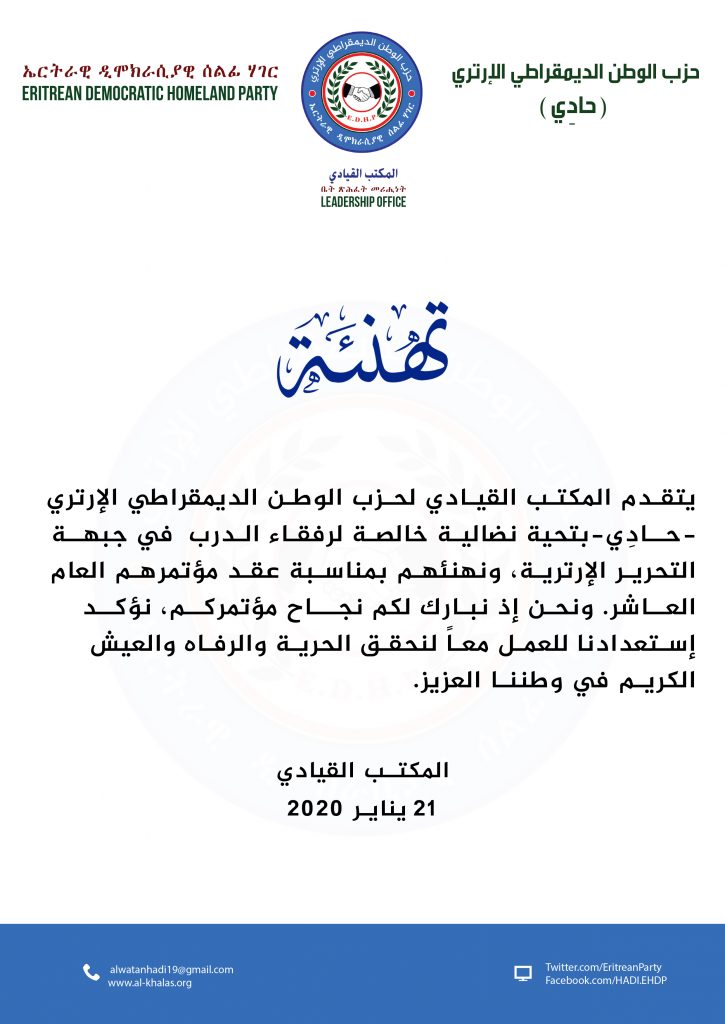 حزب الوطن يهنئ جبهة التحرير الإرترية