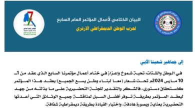 حزب الوطن الديمقراطي الارتري البيان الختامي لأعمال المؤتمر العام السابع